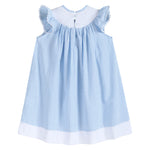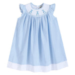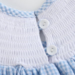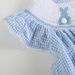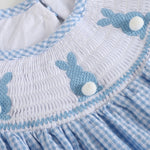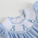 This precious Blue Gingham Easter Bunny Smocked Bishop dress is sure to make your little one "hop" for joy! Featuring a light blue gingham pattern, smocking at the neckline, and a delightful bunny embroidery with pom pom tails-- this dress will keep your girl looking "egg"-cellent all season long!